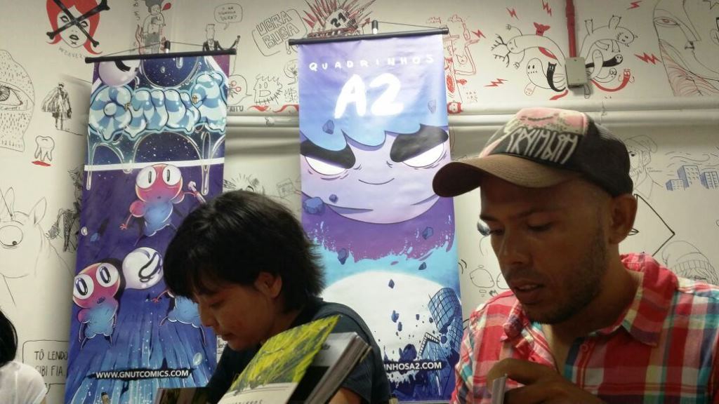 Com a simpatia e a paciência de sempre, os dois autografaram os exemplares do Quadrinhos A2 #4 e também de seus outros trabalhos, como os demais números da série A2 e Gnut, projeto de Crumbim. Várias pessoas conseguiram ler a nova edição durante a fila formada para conseguir os autógrafos. Para quem está acostumado, esperar a sua vez na fila não foi problema. Longe disso.