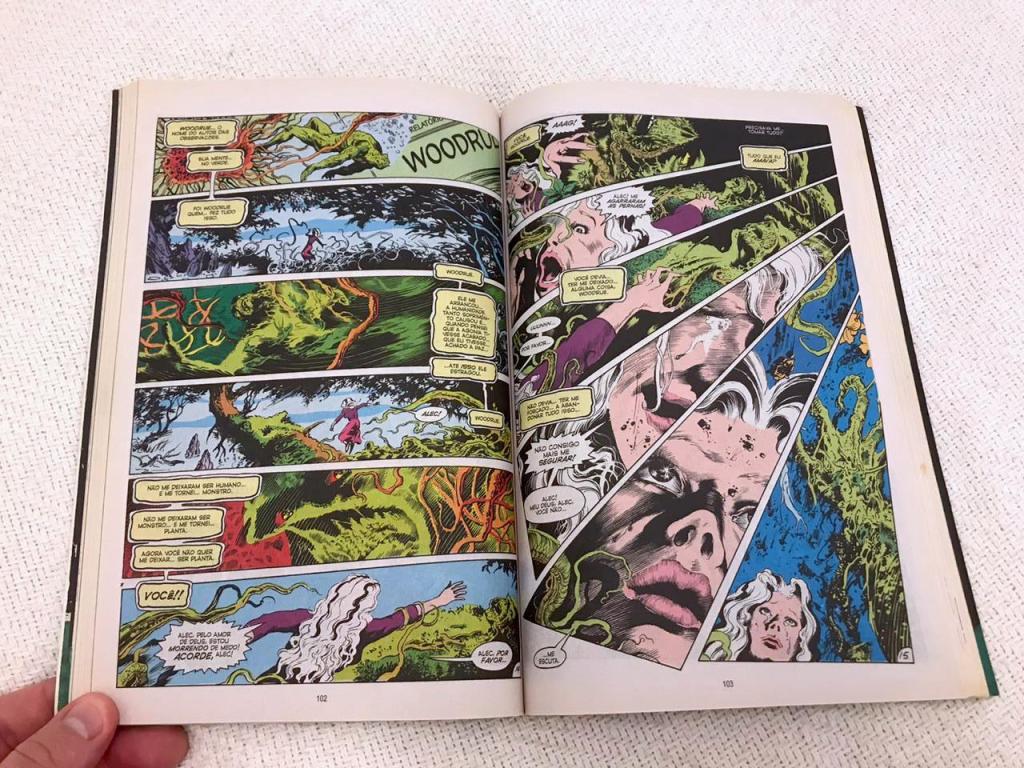 O próximo arco começa a apresentar a concepção que Moore tinha para seu protagonista e também revela um novo antagonista, Dr. Jason Woodrue – o Homem Florônico. E aqui, antagonista é a palavra adequada, porque o conceito de vilão malvado sem profundidade é trocado por personagens com motivação, traumas e psicopatias.
